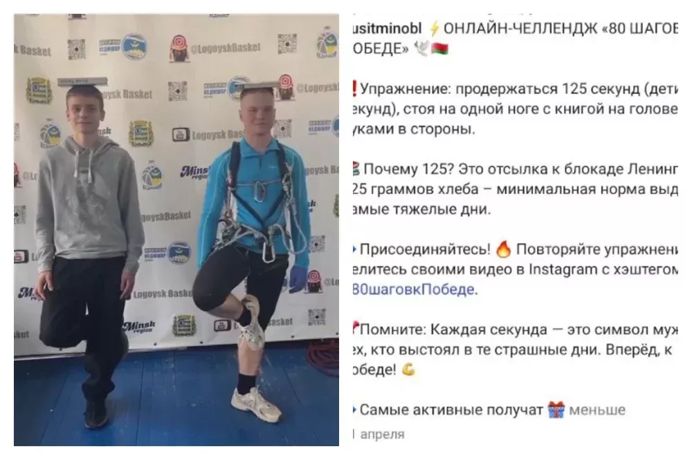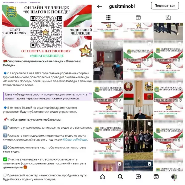 Это примерно как в Белоруссии, где Главное управление спорта и туризма Минского исполкома запустило акцию "80 шагов к Победе". Цель челленджа - объединить спорт и историческую память, почтить подвиг героев через личные достижения участников. Организатор публикует задания, а участники акции выполняют его, после чего выкладывают видео в соцсети.