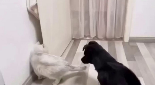 Домашний кот решил побаловать себя кормом, спрятанным за дверью. Питомец не придал значение тому, что за ним увязался хвост. Вскоре кот пожалел об этом.