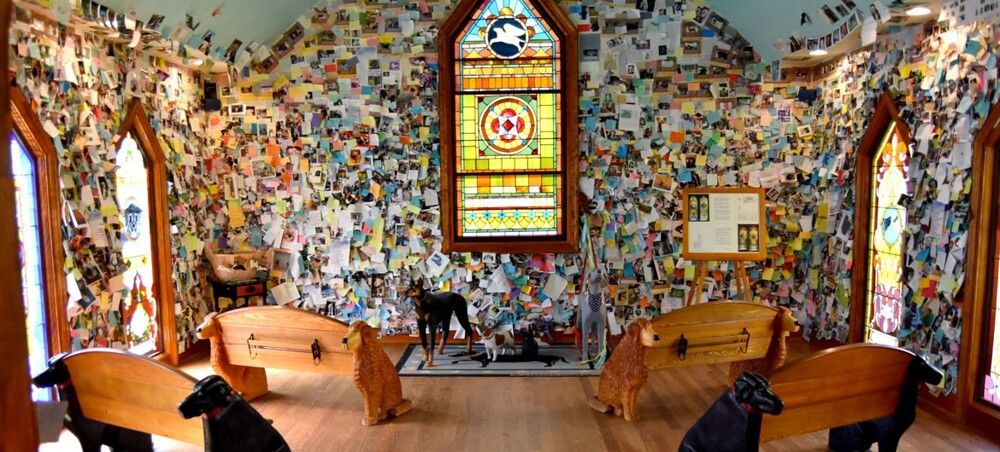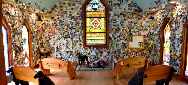 При входе в часовню человека буквально заливает свет, исходящий от витражей, на которых изображены собаки, украшенные резьбой по дереву. Внутренние стены увешаны рукописными заметками и фотографиями собак и других животных, которые ушли из жизни, а на столах выставлены угощения для посетителей. Вокруг Собачьей горы установлены различные скульптуры собак, а вывеска перед часовней гласит: "Приветствуются представители всех вероисповеданий, всех пород. Догмы запрещены".