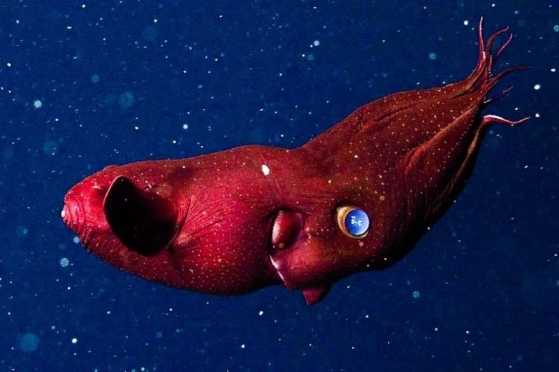 Этот глубоководный житель (3000 метров ниже поверхности) получил пугающее латинское имя Vampyroteuthis infernalis - "вампир-кальмар из ада".Его отличают интересные особенности: