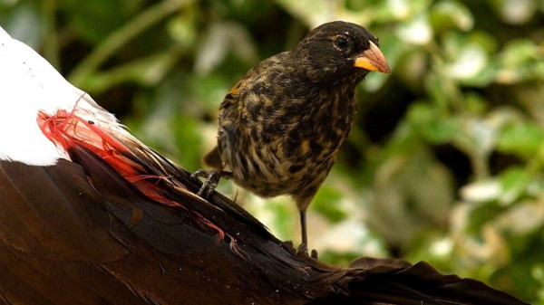 Среди знаменитых дарвиновых вьюрков есть один необычный подвид - остроклювый земляной вьюрок, освоивший вампиризм. Обитает только на 2 засушливых островах архипелага. Основной рацион - семена, но в сухой сезон переключается на кровь. Расклёвывает кожу на спине олуш - крупных морских птиц, и ждёт, пока ранка не начнёт кровоточить. Хитрая птица дозирует укусы, чтобы жертва не сопротивлялась и спокойно переносила посягательство вьюрка. Эволюция на Галапагосах создала не только травоядных истребителей семян, но и единственную в мире певчую птицу-вампира.