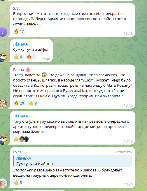 Петербуржцев такое отношение к символу воинской памяти оскорбило до глубины души. Горожане публично возмутились, потребовав убрать скульптуру с площади Победы до 9 мая. Редакция сайта 78.ru. направила запрос об этом в районную администрацию, а также в Комитет по печати и Центр рекламы и праздничного оформления.
