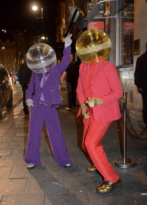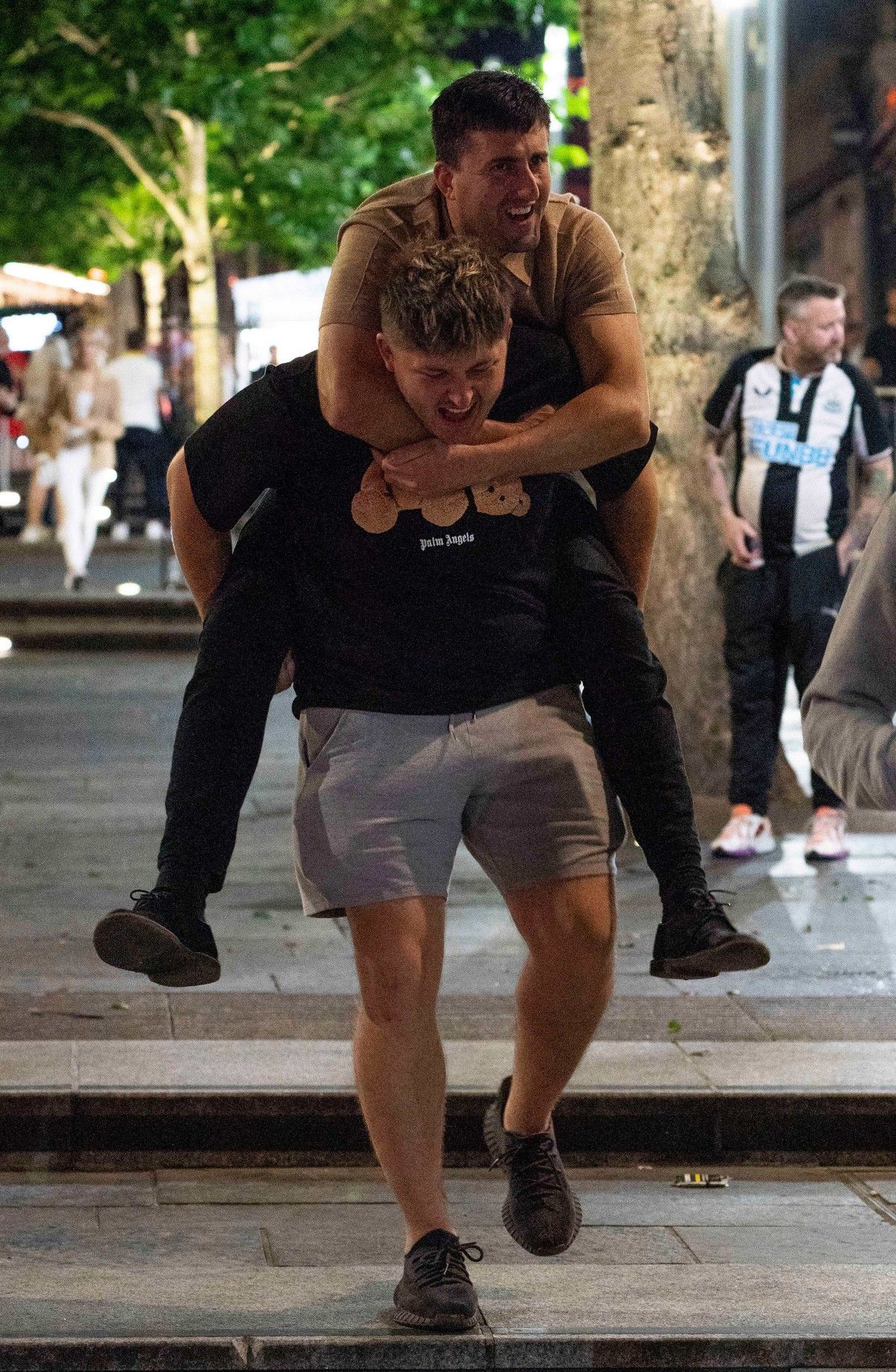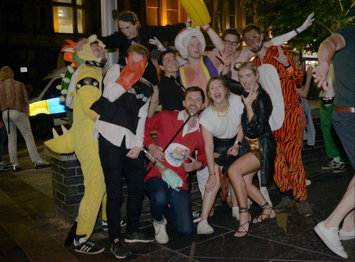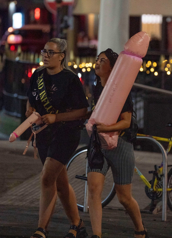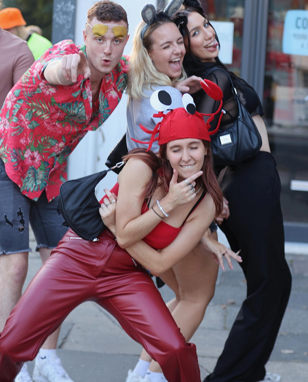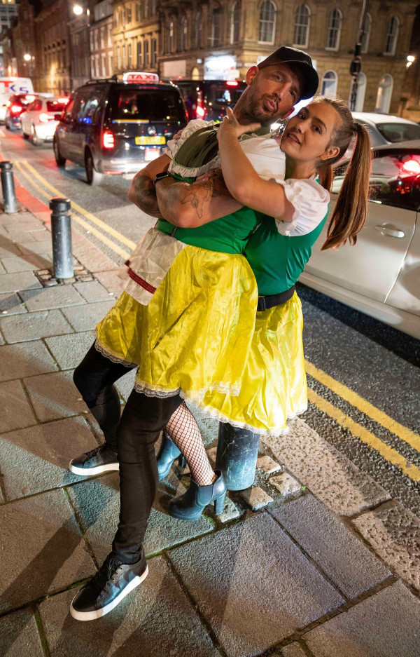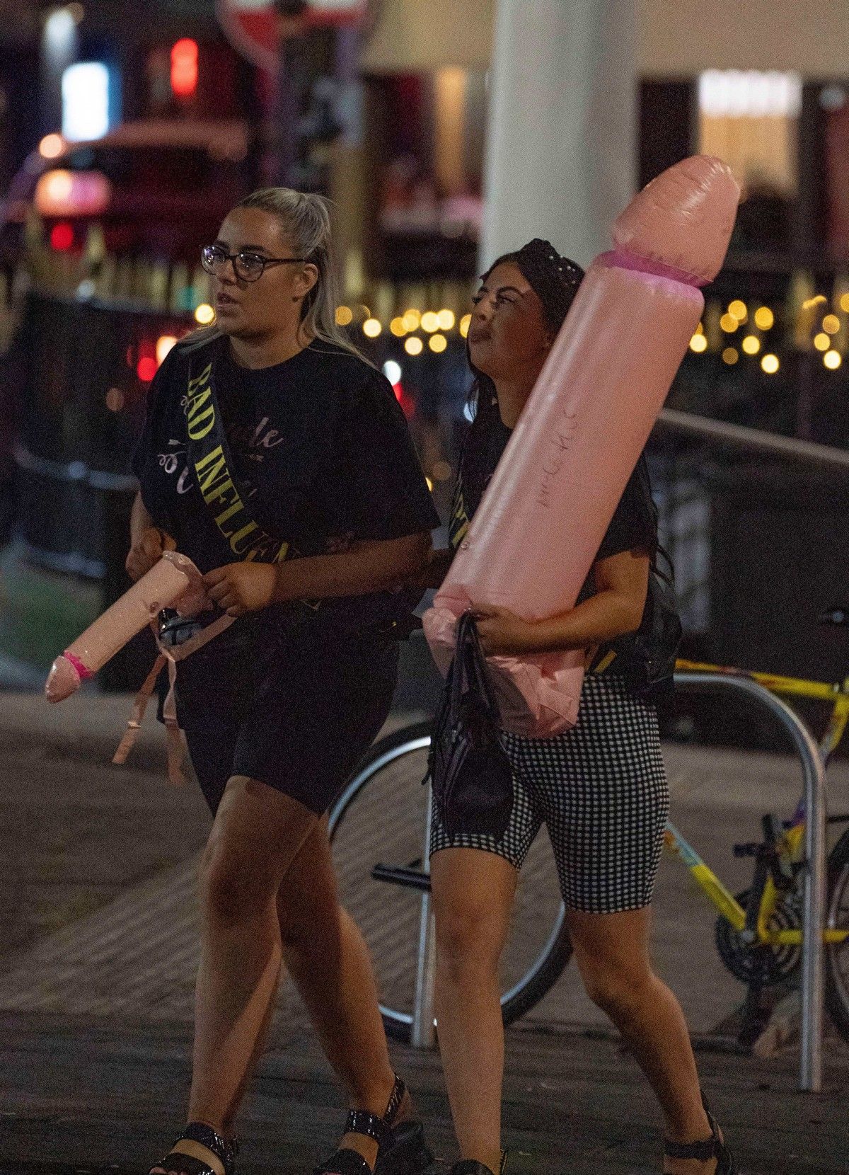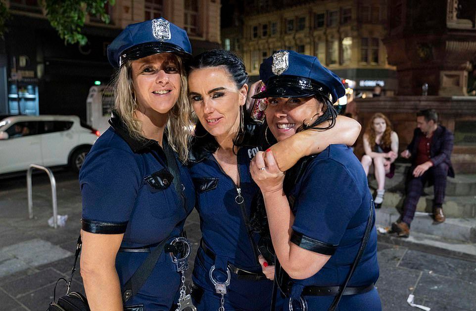 Разодетые любители выпить были запечатлены в Лидсе танцующими, в то время как другие в Ньюкасле с удовольствием позировали на улицах.Мужчина был сфотографирован катающимся на спине своего друга, в то время как две приятельницы были запечатлены на камеру с гигантским надувным пенисом.Также был сфотографирован мужчина, задержанный полицейскими.