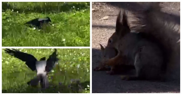 Жительницы Санкт-Петербурга увидели, как белка пыталась защитить детёныша от вороны. Девушки прогнали пернатого агрессора и передали бельчонка маме.