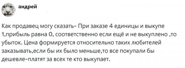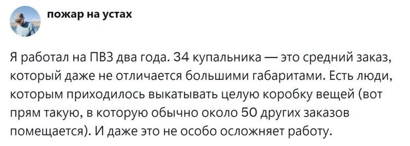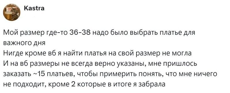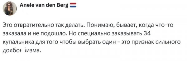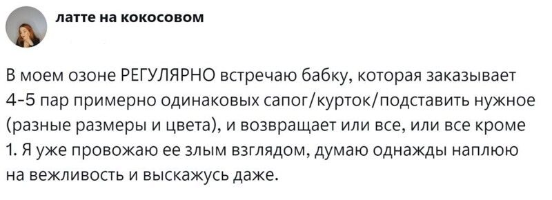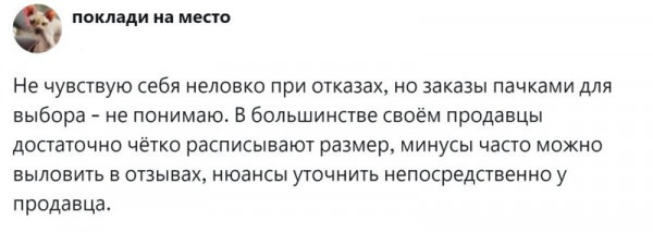 Но возникла другая проблема, из категории морально-этических вопросов. Одни покупатели чувствуют себя неловко, когда заказывают одну вещь в двух размерах, чтобы выбрать подходящий, и им приходится возвращать вторую, причиняя неудобство и добавляя работы огромному количеству людей. Тогда как другие спокойно заказывают десятки разных вещей, полдня проводят в пункте выдачи, на несколько часов занимая примерочные, и в итоге ничего не забирают. Пользователи в попытке достичь баланса в этой злободневной теме разделились на два лагеря.
