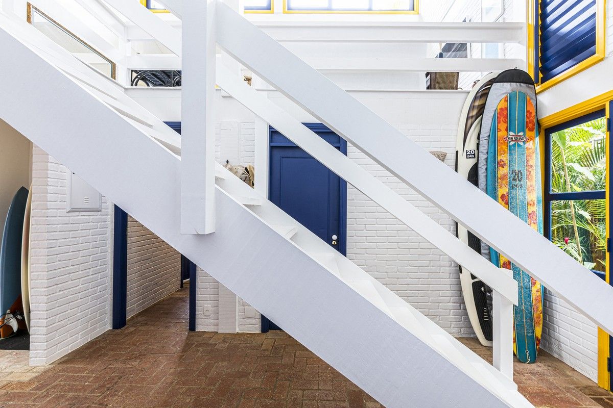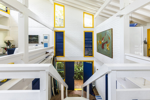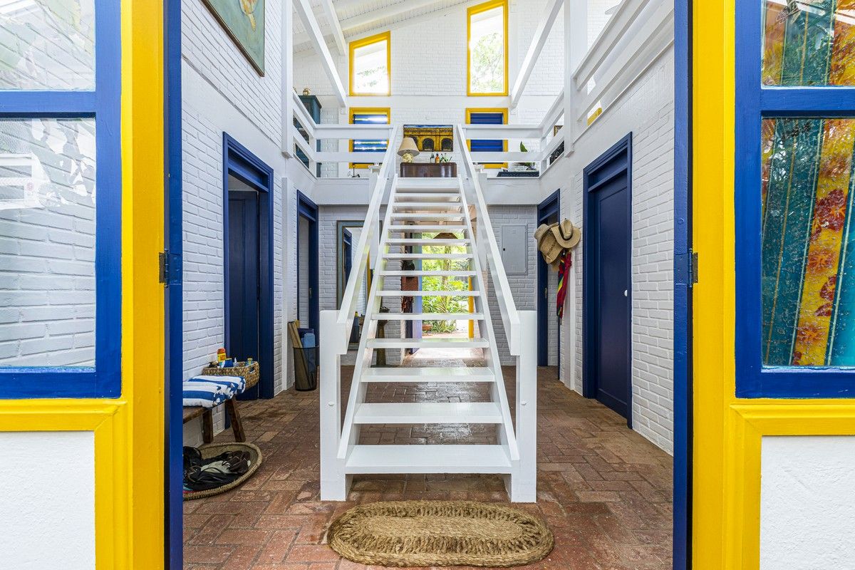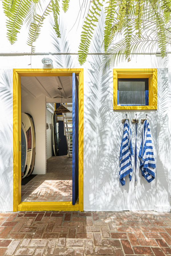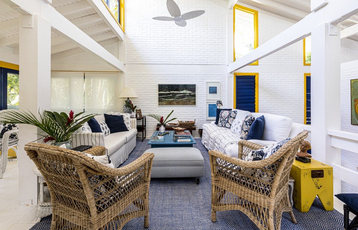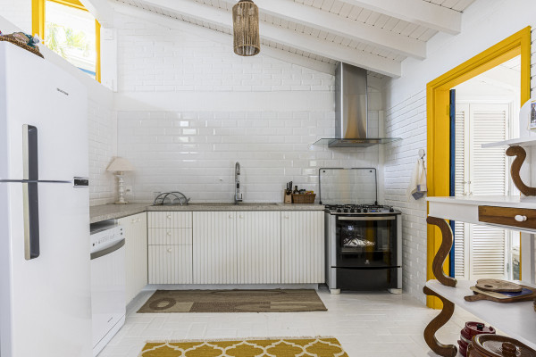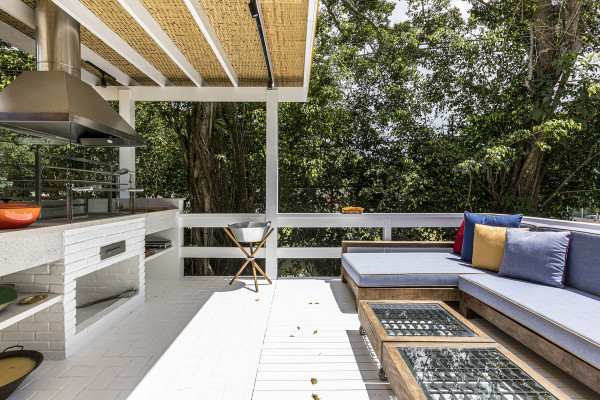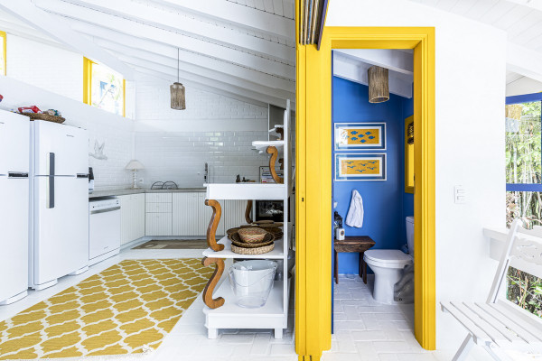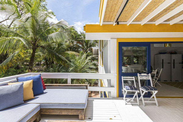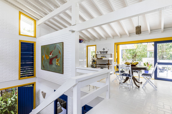 Дом был построен в 1980-х годах в небольшом кондоминиуме, состоящем всего из четырех домов, отличающихся простой архитектурой со структурой деревянных колонн, балок и кирпичных стен, большими окнами и натуральными материалами с естественной цветовой палитрой. Главной их достопримечательностью являлась роскошная природа - атлантический лес и чистое море.Новому владельцу дома помимо расширения имеющейся площади архитекторы предложили провести полную реконструкцию здания, в том числе, структурную, электрическую и гидравлическую реформу, в которой оно давно нуждалось. В результате реализации проекта появился этот необыкновенно элегантный дом с интересными дизайнерскими решениями, удобной планировкой и ярким уютным интерьером. Новые помещения, пристроенные к дому, органично связаны с оригинальным зданием и воспринимаются как часть одного архитектурного объекта общей площадью 80 квадратных метров.Верхний этаж дома занимает социальная зона открытого плана - гостиная, столовая и кухня, которая связана с большой открытой террасой, в которой оборудована летняя кухня с зоной барбекю и большая зона отдыха на свежем воздухе. На нижнем этаже находится приватная зона с 4 спальнями и индивидуальными душевыми и санузлами. Этажи дома соединены большой деревянной лестницей, расположенной в центре здания. Она выкрашена в белый цвет, что делает ее особенной нарядной. Использование жизнерадостных ярко-желтых и синих вкраплений во внешнем и внутреннем оформлении дома эффектно оживляют пространства и создают атмосферу праздника.