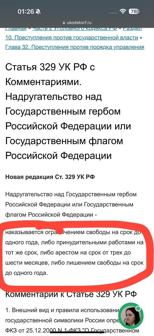 Между тем, подобные действия попадают под статью УК РФ "Надругательство над Государственным гербом или Государственным флагом Российской Федерации".