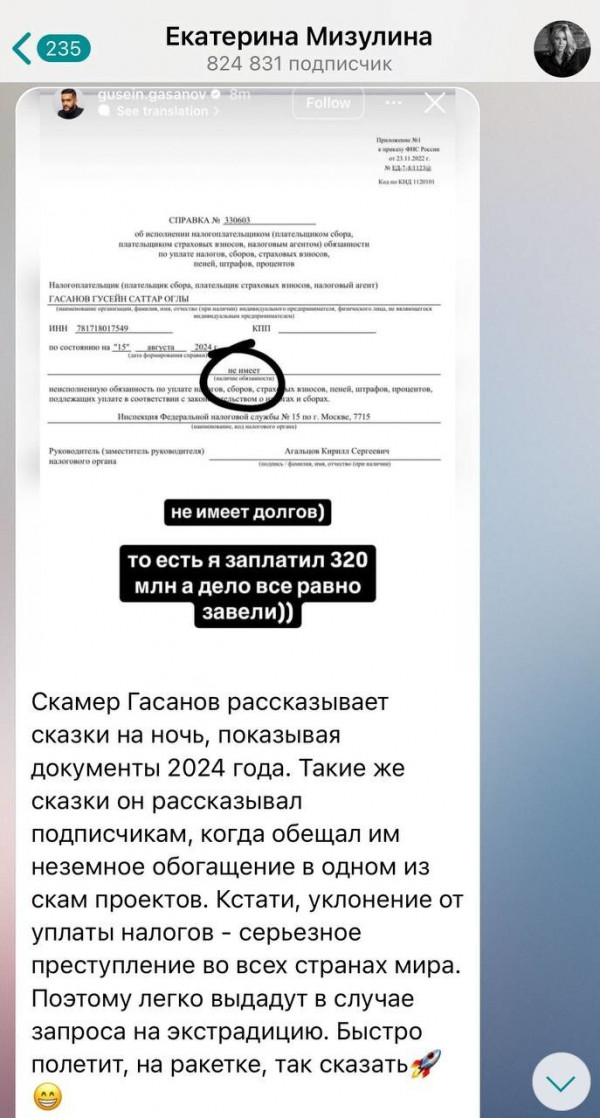 Блогер, которого обвиняют в неуплате налогов, опубликовал справку из ФНС от 2024 года. В ней говорится, что долгов у него нет. Не поверившую в эту историю Е.Мизулину Гасанов хочет убрать из Телеграм.