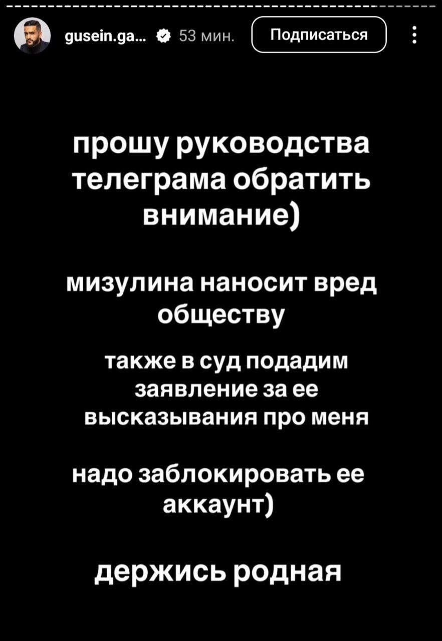 А сам Гасанов опубликовал историю, в которой попросил руководство соцсети Телеграм обратить внимание на публикации Екатерины и заблокировать её аккаунт. Также он пообещал подать на Мизулину в суд.