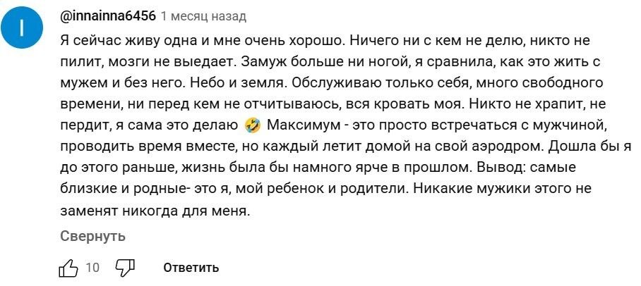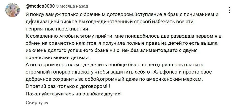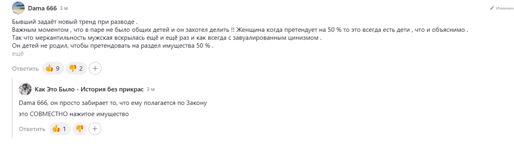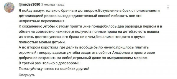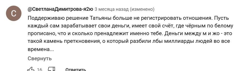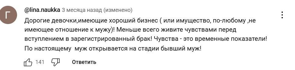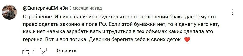 Татьяна - успешный предприниматель, она сумела заработать и на покупку дома, и на машин. Её супруг долгое время был в найме, поэтому основная имущественная база семьи была куплена женой. А теперь муж хочет получить половину того, что нажито в браке, несмотря на то, что всё это приобреталось на деньги Татьяны.Комментаторы под видео удивились этой истории. Девушки сообщили, что теперь, если и пойдут под венец, то только с брачным договором, а еще лучше и вовсе не расписываться, а жить каждый сам по себе.