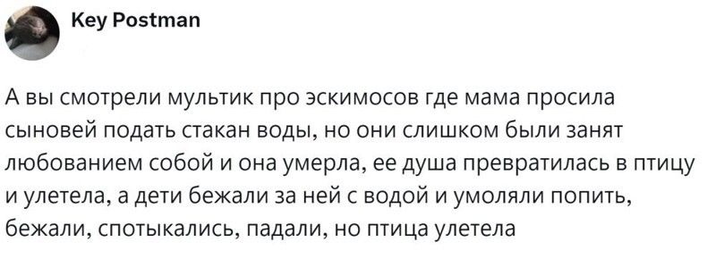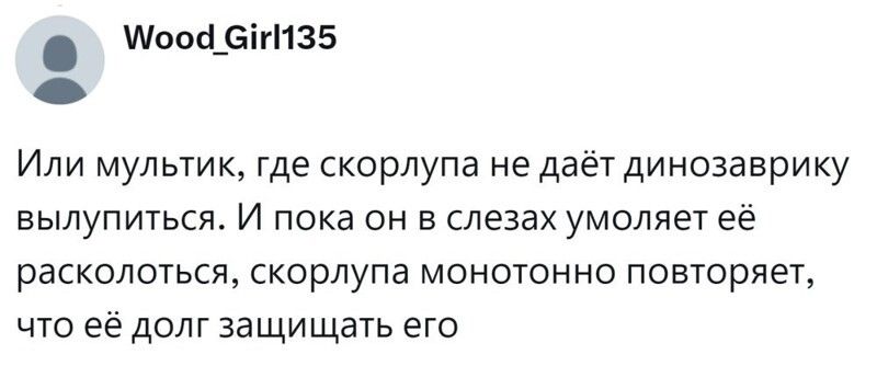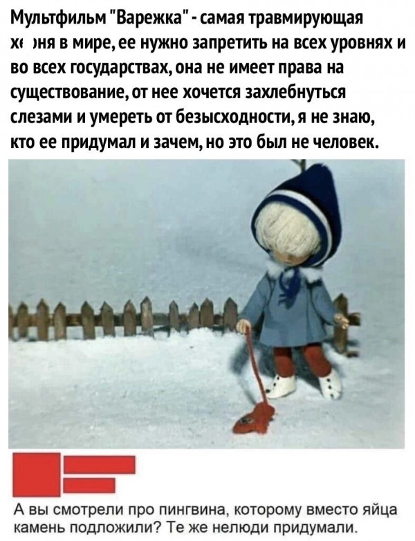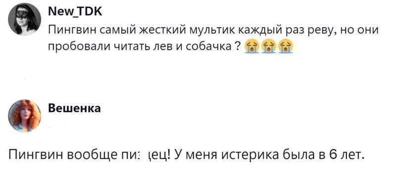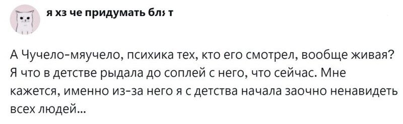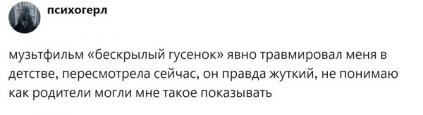 Некоторые прекрасные добрые мультики с замечательным посылом оказали на детей такое сильное действие, что трансформировались во взрослом возрасте в психологическую травму. А попытка пересмотреть мультфильм и справиться с эмоциями заканчивается стрессом и слезами. Чем руководствовались создатели таких анимационных фильмов, и почему не учли тонкую душевную организацию детей? Пользователи обсудили топовые мультики нашего детства, которые произвели неизгладимое впечатление при просмотре и продолжают это делать, и поделились своим мнением по этому поводу.