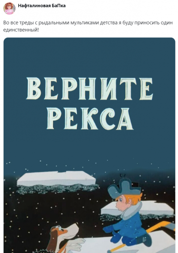 Советский мультфильм, от которого комок в горле. Серёжа и его пёс Рекс были неразлучны, пока ледоход не разлучает их. Рекс спасает хозяина, но сам гибнет.Родители скрывают правду, а мальчик отчаянно звонит ветеринару, представляясь то милиционером, то министром: "Верните Рекса!" Добрый доктор Валерьяныч, будучи не в силах сказать горькую правду, решает подарить мальчику нового друга.Он спасает щенка от жестокого хозяина и привозит его Серёже. "Это не Рекс..." - говорит мальчик. "Рекс умер. Но этому щенку тоже нужен друг" - признаётся врач.Слёзы, объятия и новая дружба. А финал с клюшкой доказывает: дух Рекса живёт в этом озорном щенке. Всё это грустно, честно, по-настоящему. Шедевр "Союзмультфильма" о любви, потере и надежде.