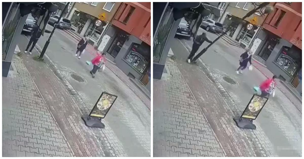 Уличный фонарь неожиданно упал на женщину в польском городе Новы-Тарг. Фонарь не выдержал веса облокотившегося на него прохожего.