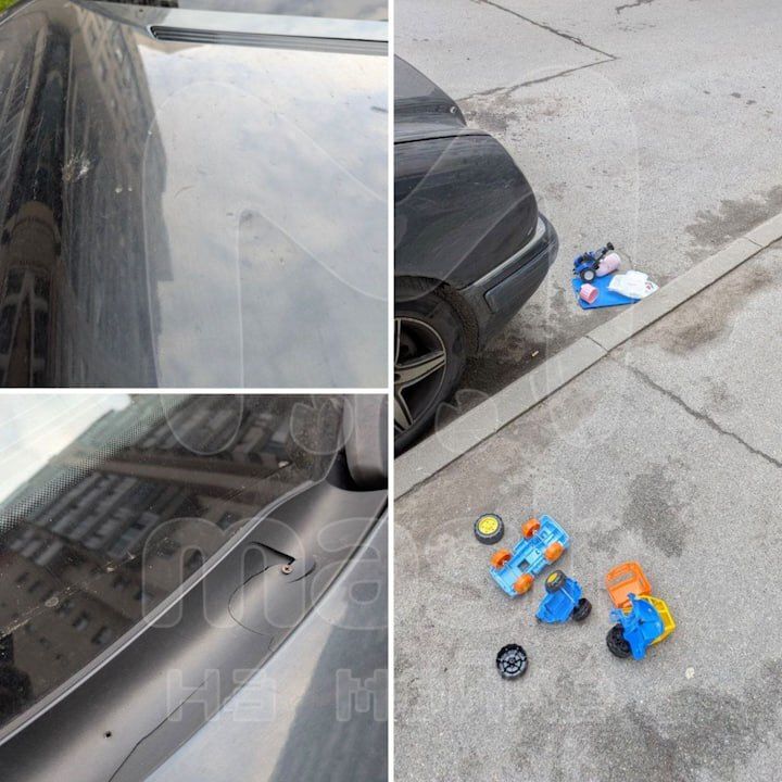 В качестве снарядов - игрушки. Поражённая цель - парочка припаркованных машин.