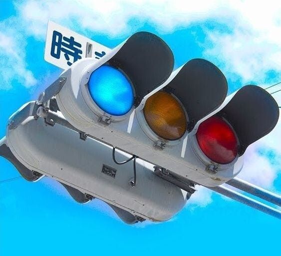Первое, что бросается в глаза - зелёный сигнал здесь вовсе не зелёный, а голубовато-синий. Почему?Несколько веков назад японцы не разделяли синий и зелёный - оба цвета назывались "ао". Трава, листья, яблоки - всё было "ао". Позже, под влиянием Запада, появилось слово "мидори" (зелёный), но в сознании многих светофорный "ао" остался синим.В 1973 году правительство пошло на компромисс: официально разрешило сине-зелёный оттенок. Теперь в некоторых районах можно встретить и вовсе ярко-синие огни.