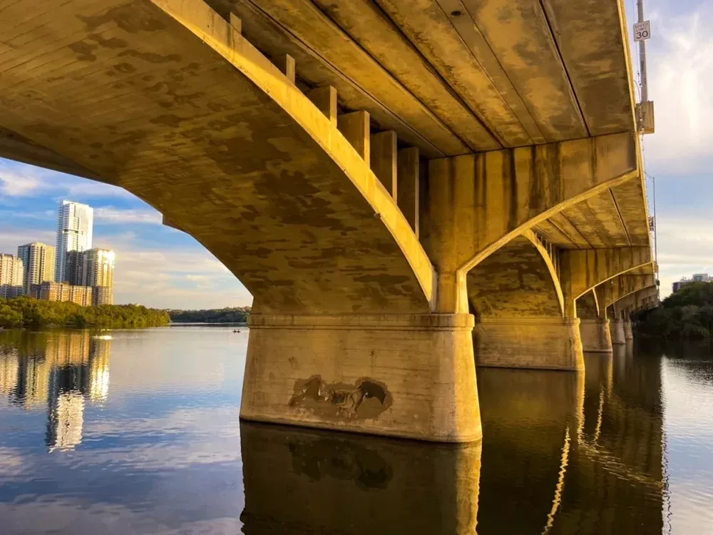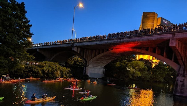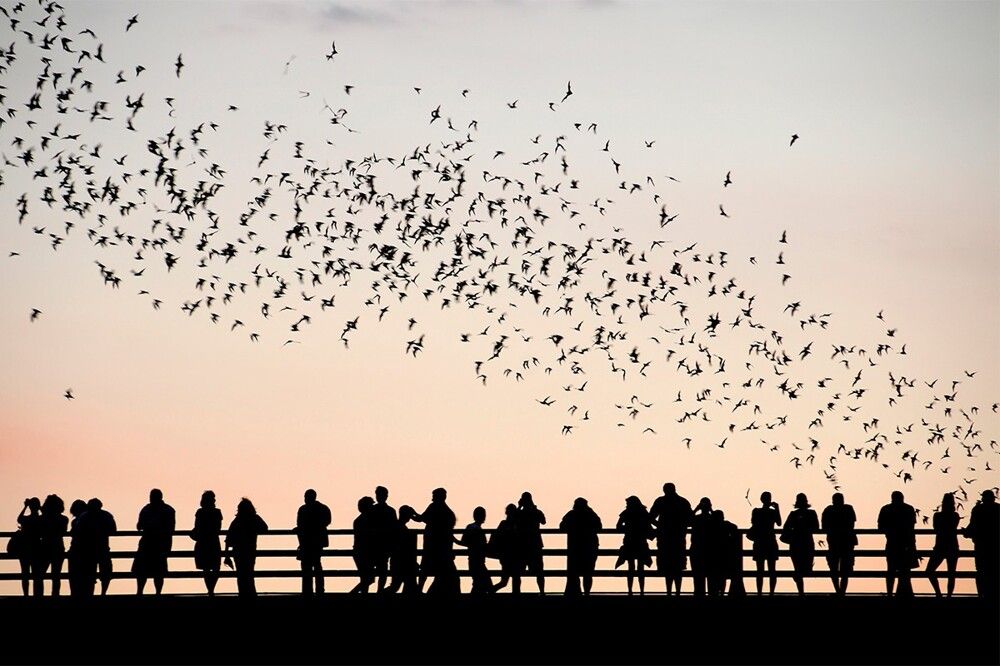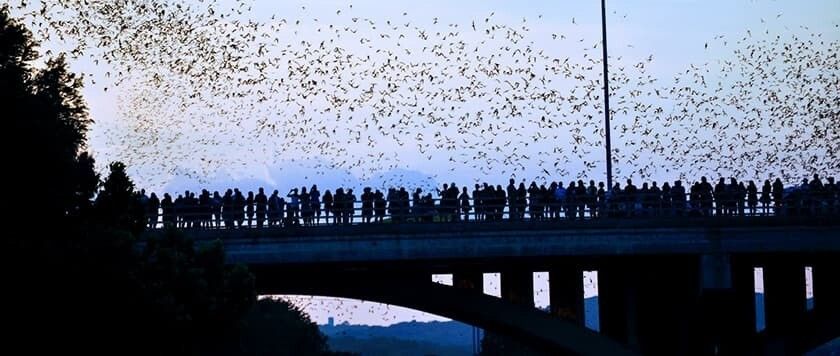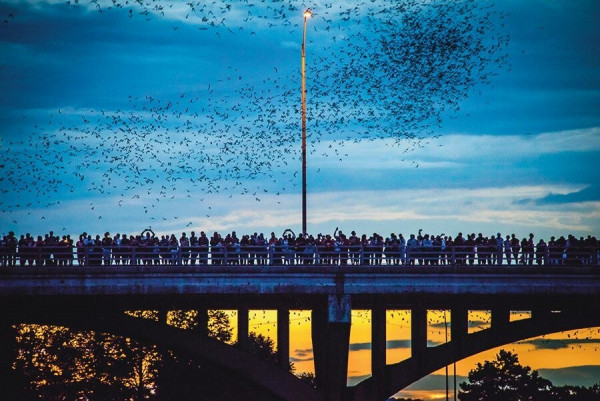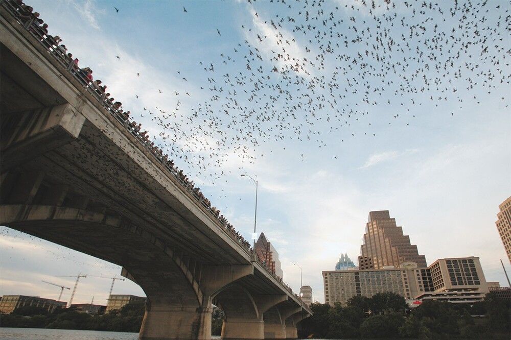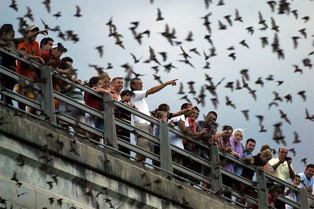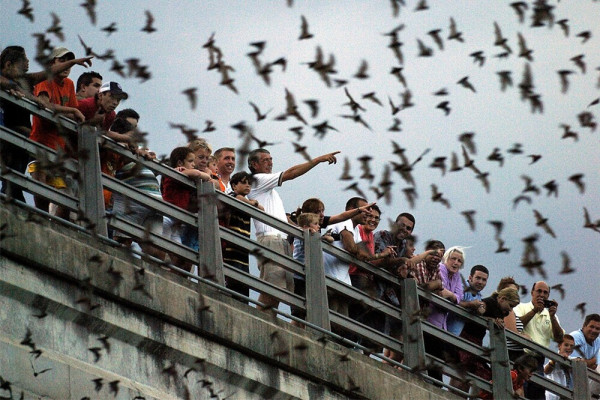 С марта по ноябрь в сумерках из-под пролётов взмывает в небо гигантская чёрная волна. Это 1.5 миллиона бульдоговых летучих мышей вылетают на охоту, становясь для зрителей настоящими крылатыми артистами.