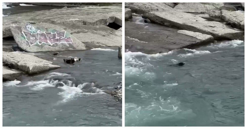 В Сочи горная река едва не унесла пса. Четвероногие друзья человека вошли в воду в надежде перебраться на противоположный берег. Одного из животных подхватило сильное течение и начало уносить в сторону.