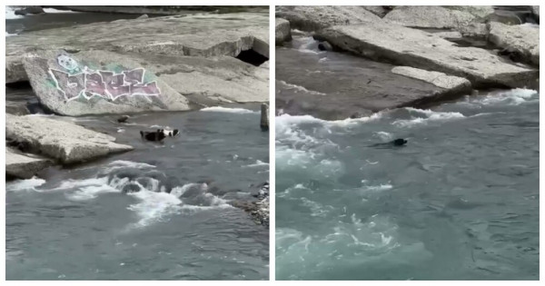 К счастью, животному удалось справиться с бурными водами. Когда пёс приблизился к берегу, к нему на помощь поспешил его друг.