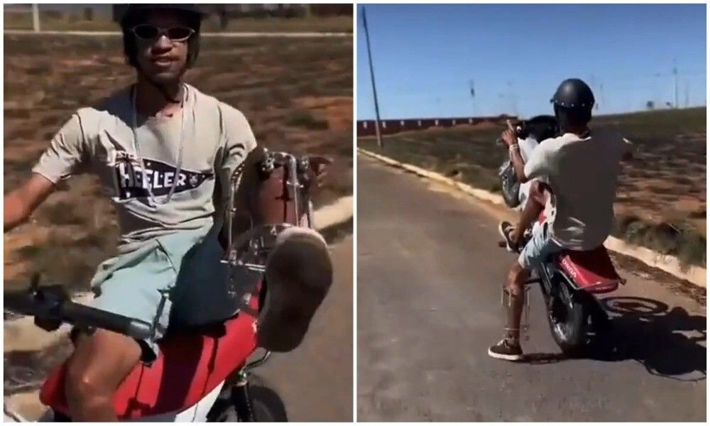 Отважный идиот уже сломал одну ногу, и не успев залечиться, поехал за новыми переломами на своей "Хонде Поп 110".