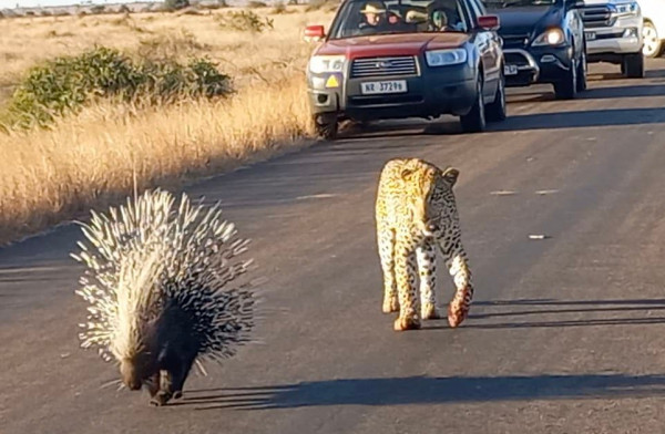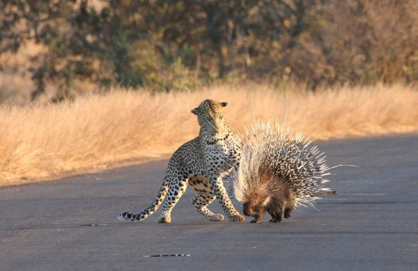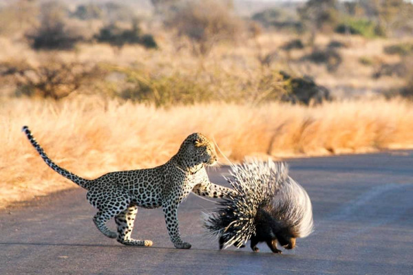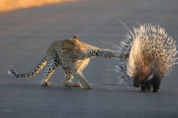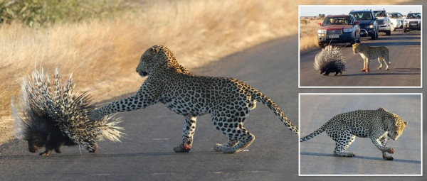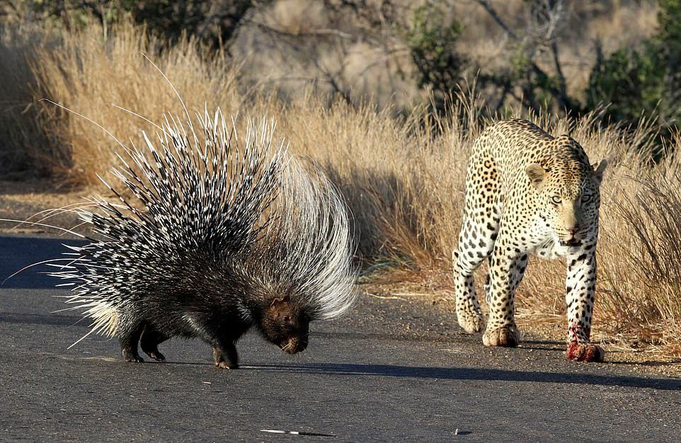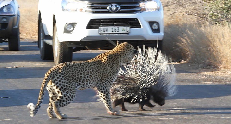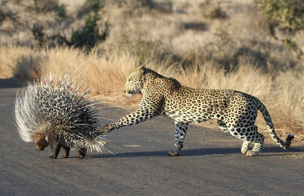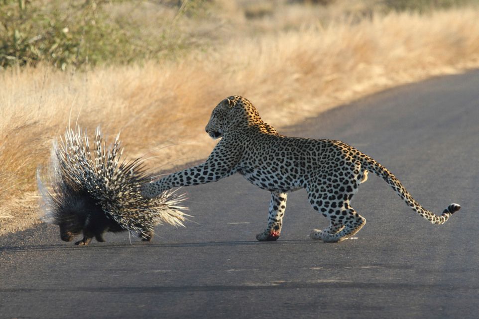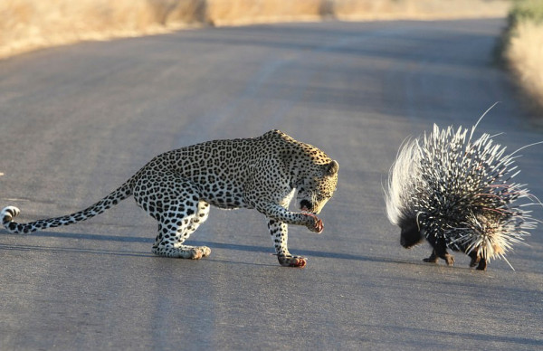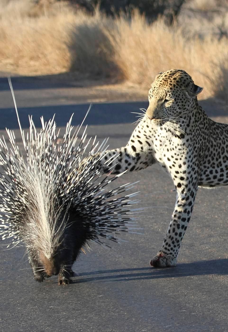 Молодому леопарду пришлось обуздать свой инстинкт убийцы после того, как он набросился на дикобраза. Большая кошка потратила 90 минут, пытаясь преодолеть колючки своего потенциального обеда. Он даже делал перерывы, чтобы вытащить иглы из своих раненых лап, прежде чем попытаться снова. Но его колючей добыче это не нравилось, и леопард в конце концов сдался.