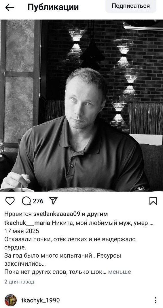 16 мая Ткачука госпитализировали в тяжёлом состоянии. У спортсмена развилась почечная недостаточность, его погрузили в медикаментозную кому, однако начался отёк лёгких. В результате бодибилдер скончался."Никита, мой любимый муж, умер... Отказали почки, отек легких и не выдержало сердце. За год было много испытаний. Ресурсы закончились... Пока нет других слов, только шок...", - написала его жена Мария.