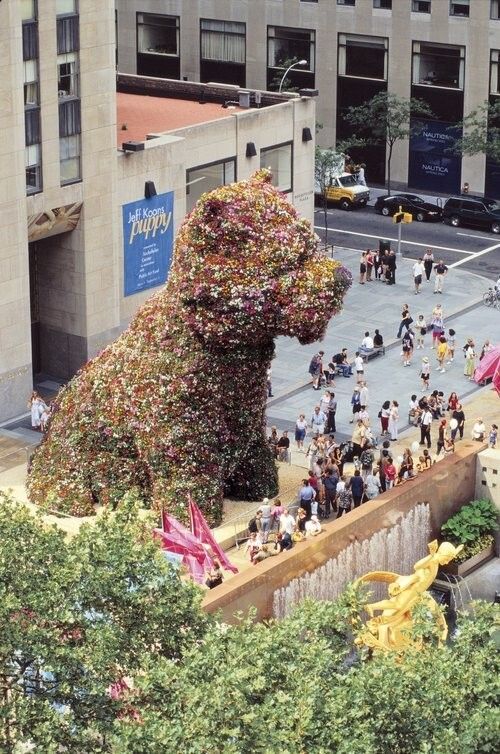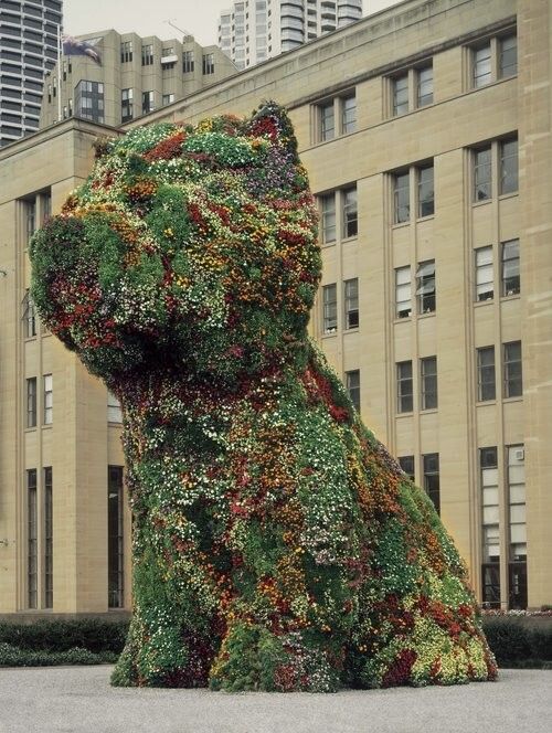 Созданный в 1992 году, этот 13-метровый зелёный чудик в виде вест-хайленд-уайт-терьера должен был стать символом оптимизма. Художник хотел вызвать чувство уверенности и безопасности и выбрал для этого образ дружелюбного щенка, покрытого цветами.Кунс использовал компьютерное моделирование, чтобы воплотить идею топиари (формованных растений), популярную ещё в садах XVIII века. Но если раньше такие композиции были размером с куст, то он сделал их размером с дом.