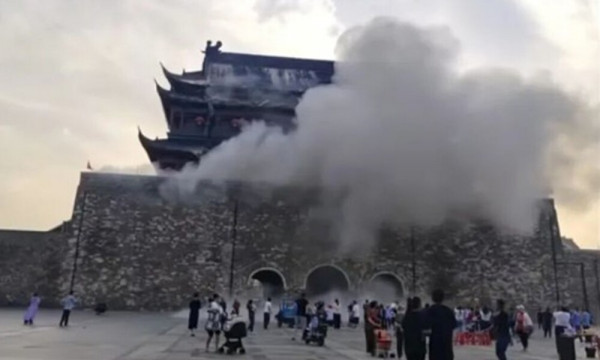 В Китае после ремонта обрушилась кровля 650-летней Барабанной башни. Инцидент сняли на видео находящиеся поблизости туристы.
