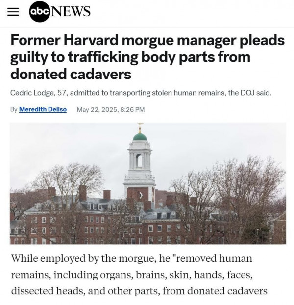 Есть такие замечательные люди, которые и после смерти хотят быть полезными для остального человечества и завещают свои останки науке, ну там на эксперименты всякие.Так вот, наша история началась в 2018 году, да не где-нибудь, а в морге Гарвардского университета. Трудился там не покладая рук очень предприимчивый мужик по имени Седрик Лодж, 57 лет от роду. Должность у него была хорошая - целый управляющий моргом. Именно он-то и отвечал за трупы людей, которые завещали свои останки науке.