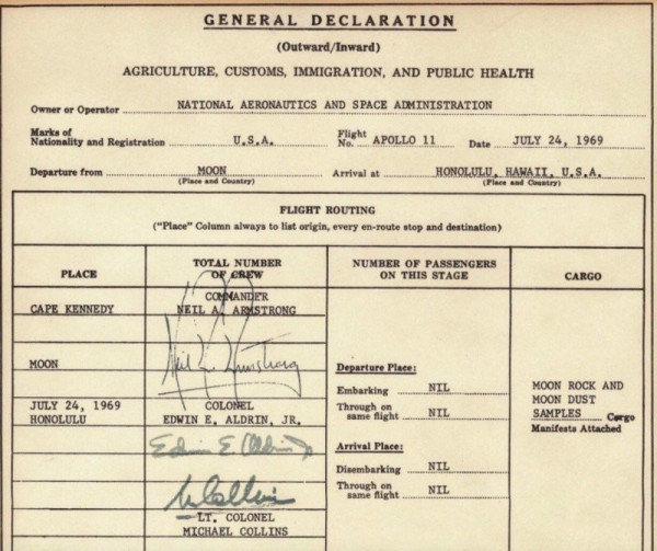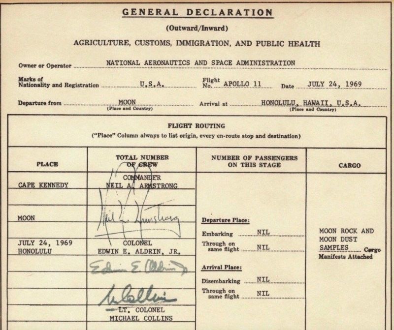 После возвращения с Луны экипаж "Аполлона-11" - Армстронг, Олдрин и Коллинз заполняли таможенную декларацию. В графе "Пункт отправления" стояло: "Луна", а в "Месте прибытия" - Гонолулу, Гавайи. В списке груза значились лунные камни, грунт и пыль.
