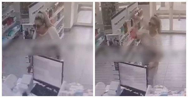 Женщина сначала будто что-то активно доказывает фармацевту, та спокойно отвечает. Затем посетительница хватает товар с прилавка и швыряет его в лицо сотруднице аптеки. Увернуться у той не получается, так как она стоит слишком близко. Перед выходом из аптеки скандалистка берет флакон с полки со средствами для волос и через зал кидает его в аптекаря, но промахивается.
