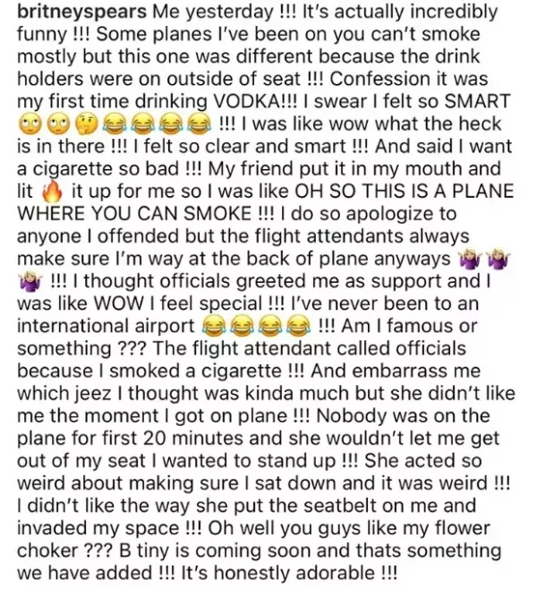 Отмечается, что стюардессы попросили ее погасить сигарету и после некоторых препирательств она их послушала. Как сообщили источники издания, с певицей было "трудно".Когда самолет приземлился, поп-принцессу встретили представители власти и вынесли ей предупреждение, после чего ее освободили.Позже Спирс прокомментировала ситуацию в соцсетях, заявив, что "в первый раз пила водку". "Я извиняюсь перед всеми, кого я обидела, но бортпроводники всегда следят за тем, чтобы я была в самом конце самолета! <...> Никого не было первые 20 минут, и они не позволяли мне вставать с места, я хотела встать! Она вела себя так странно, чтобы убедиться, что я сижу, и это было странно. Мне не понравилось, как они пристегнули меня ремнем безопасности и вторглись в мое пространство", - написала она.