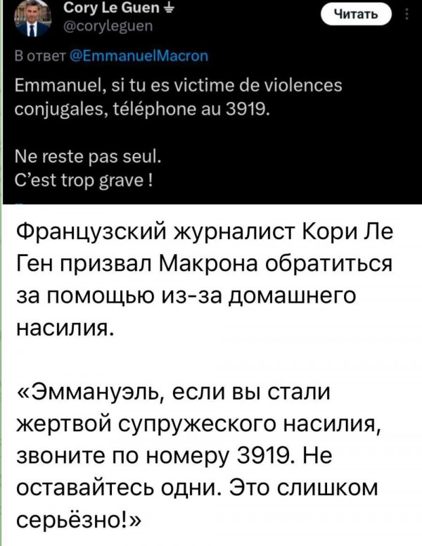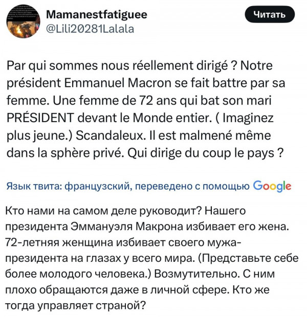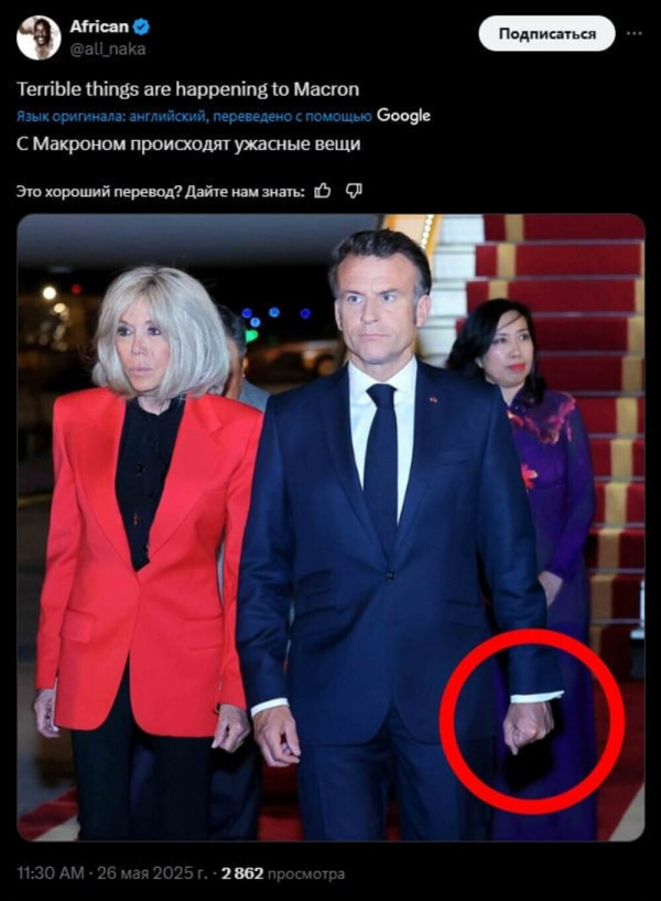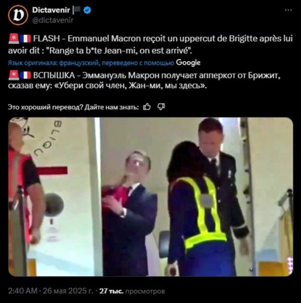 Президент Франции Эммануэль Макрон прокомментировал инцидент с ударом по лицу от своей супруги Брижит на выходе из самолёта, видео с которым рассмешило облетело весь мир. Он заявил, что не ссорился с женой, а дурачился. Также он пожаловался на интернет-троллей, которые раздувают сенсацию из увиденного и строят конспирологические теории."Мы препираемся, шутим с моей женой. Это раздувается до катастрофы планетарного масштаба, у некоторых людей даже возникают теории. Все это чепуха. Я вижу множество сумасшедших, которые тратят свои дни на объяснение всех этих видео. Всем необходимо успокоиться и прежде всего интересоваться сутью текущих событий", - заявил Макрон. Напомним, что ролик, в котором Брижит бьёт то ли пощёчину, то ли наносит удар тыльной стороной ладони по челюсти Макрона, то ли пытается расцарапать ему лицо, был опубликован сегодня. Сам Макрон, точнее, его пресс-служба, на официальных страничках не стала публиковать этот момент. Изначально в Елисейском дворце заявили, что кадры могли быть сгенерированы нейросетью, а их распространением занимаются пророссийские каналы. Однако позднее подлинность видео там подтвердили."Это был момент, когда президент и его жена в последний раз перед началом поездки расслабились", - заявили в его офисе.Добавим, что за последние несколько недель Макрон уже дважды попадал в ситуации, которые становились предметом громких обсуждений. Это и его палец, схваченный президентом Турции Эрдоганом, и таинственная салфетка/пакетик в вагоне поезда.