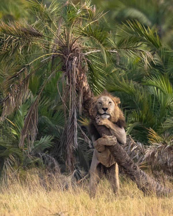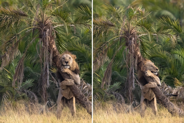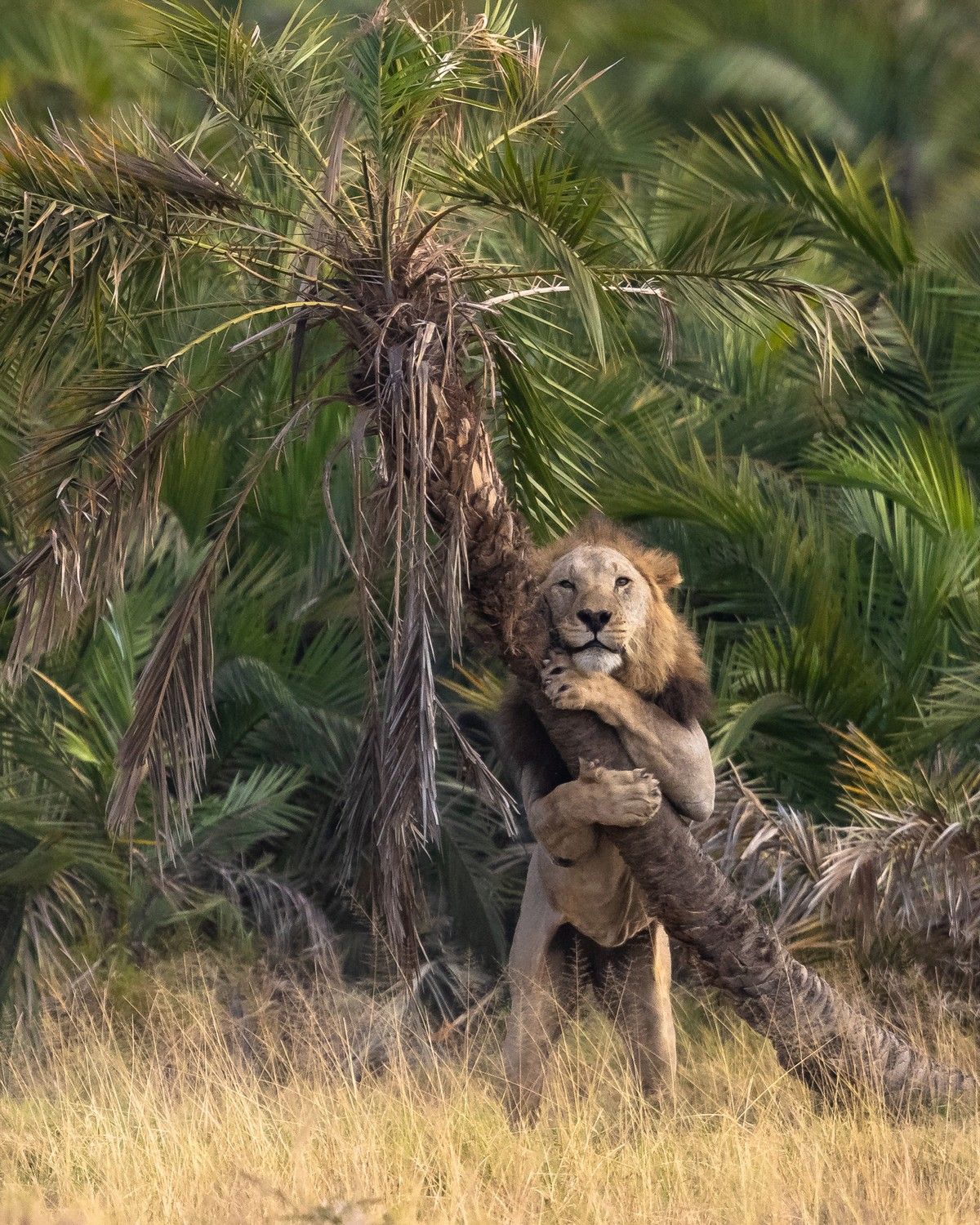 Бразильский фотограф Джулиус Дадалти (Julius Dadalti) запечатлел необычные кадры в национальном парке Амбосели, Кения. Он сфотографировал, как 226-килограммовый лев стал на задние лапы и обнял дерево.