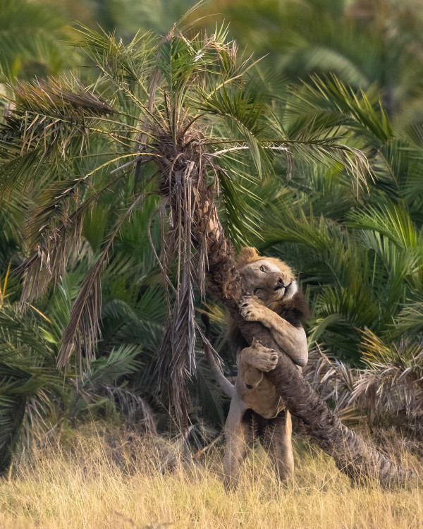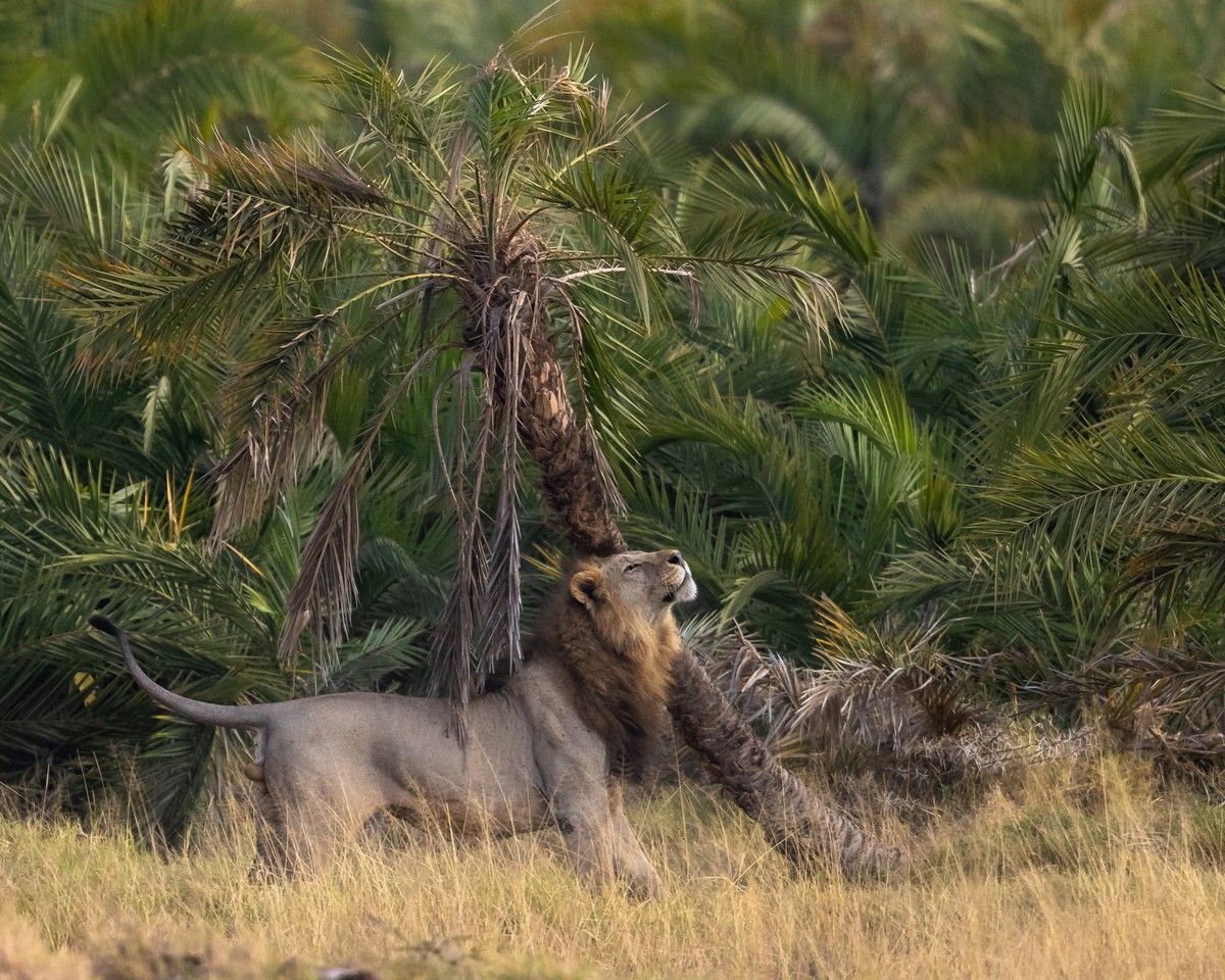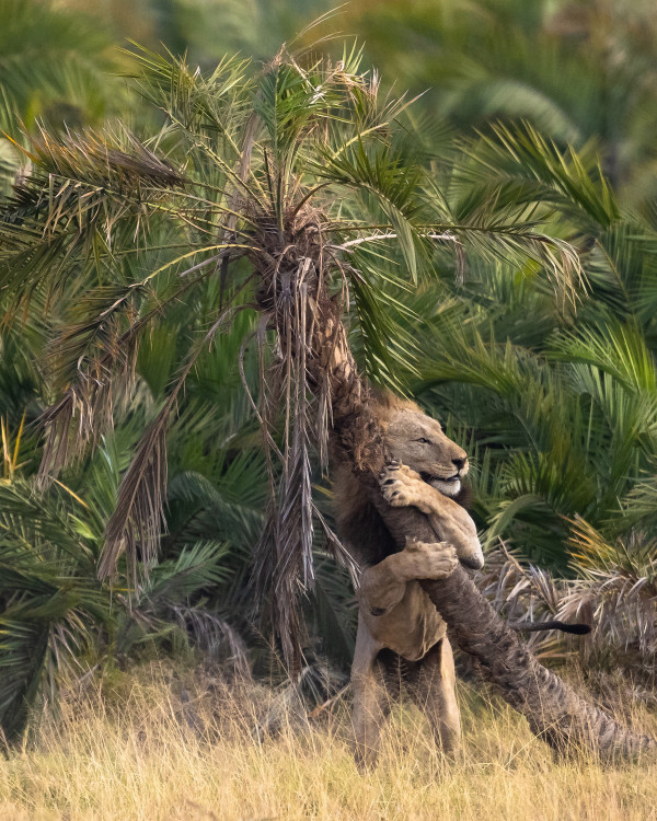 Фотограф рассказал: "Я думаю, что он метил свою территорию.- Я следовал за прекрасным прайдом, и несколько детенышей играли с двумя львицами.- Лев лежал и вел себя лениво, затем решил прогуляться.- Через несколько секунд лев вернулся и начал играть с пальмой.- За этим интересно было наблюдать, потому что действо было похоже на шоу, и иногда лев даже смотрел на меня."