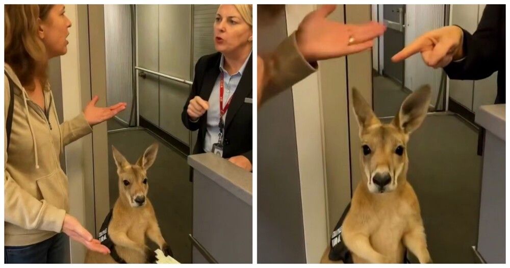 В социальных сетях набирает популярность ролик, в котором кенгуру не пускают на борт самолёта. Зверёк стоит и ждёт, пока его пропустят, пока хозяйка спорит с работником аэропорта.