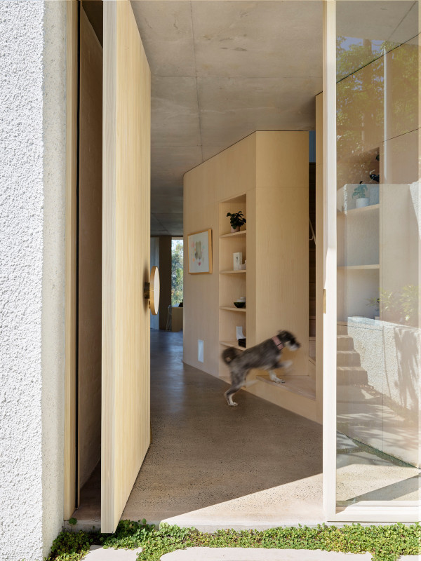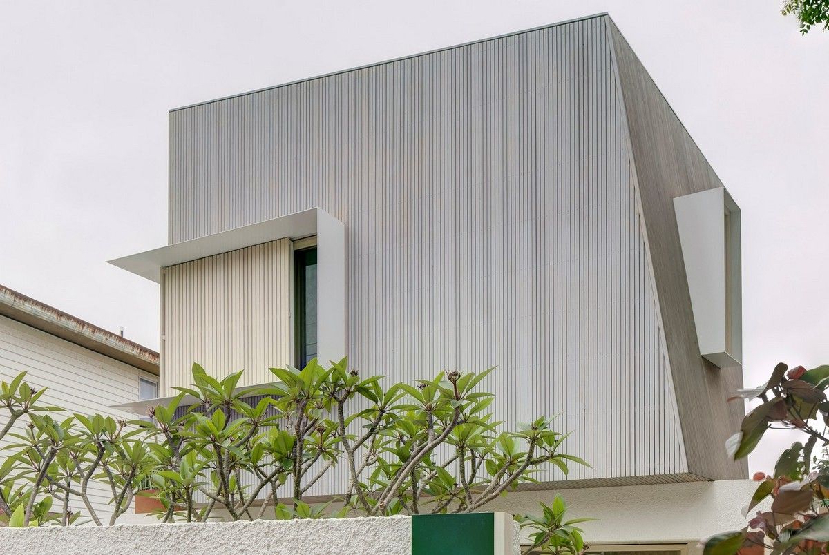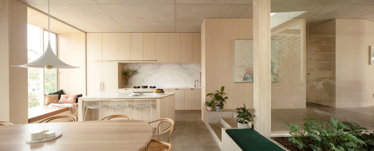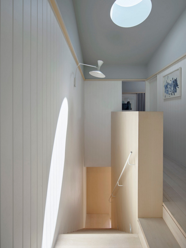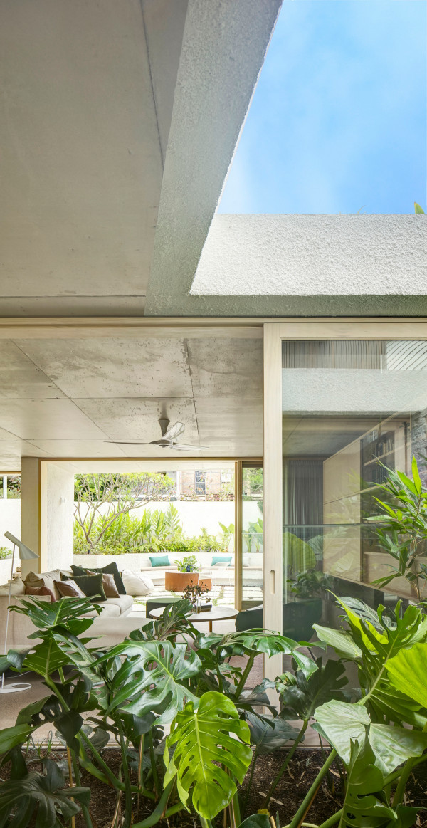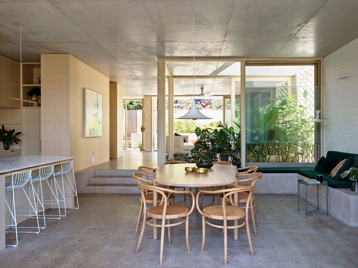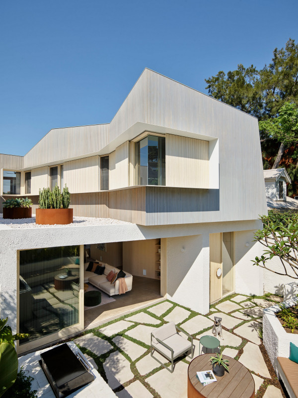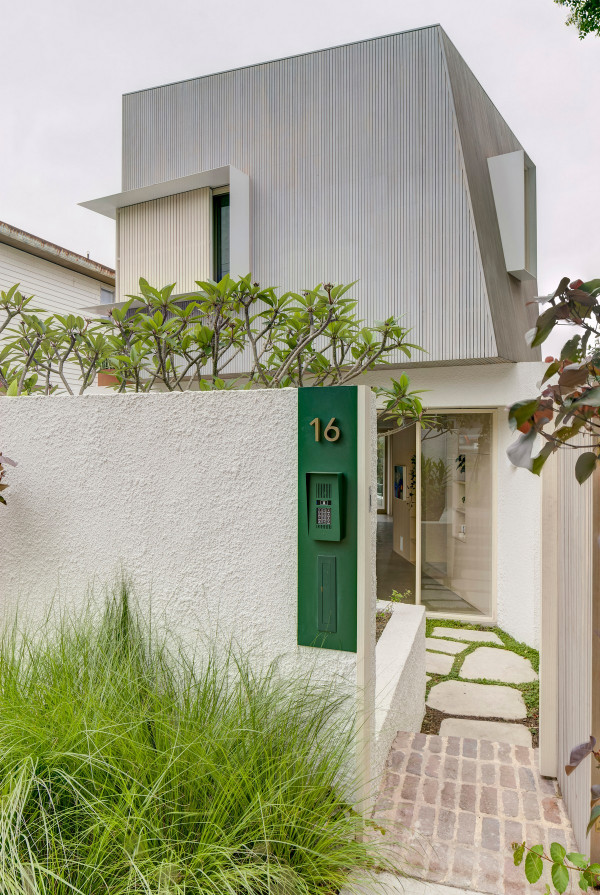 Дизайн четырехуровневого дома площадью 245 квадратных метров включает в себя гараж и два отдельных блока, предназначенных для проживания семьи и для размещения родителей или гостей. Проект стал своеобразной демонстрационной площадкой идей архитектора о комфортной жизни в современном семейном доме.Два верхних этажа занимает семья Эмили, состоящая из четырех человек и собаки. Главная спальня имеет небольшой балкон с роскошным видом на гавань, а из двух детских спален с общей ванной комнатой открываются виды на кактусовый сад. На нижнем уровне с отдельным входом с второстепенной улицы располагаются апартаменты для родителей и гостей. Они включают спальню, кухню, ванную комнату и балкон, а также просторную двухкомнатную квартиру с кухней, ванной комнатой, гостиной и балконом. Нижний этаж может плавно переходить в главный дом или, наоборот, быть заблокирован для уединения, обеспечивая в равной степени связь и приватную жизнь всех жильцов.В проекте используется простая и надежная палитра материалов, отличающаяся низкими эксплуатационными расходами и долговечностью, и, в то же время, имеющая изысканный и красивый вид. В числе доминирующих материалов - бетон, каменная кладка, древесина Accoya и березовая фанера. Бетон и каменная кладка обеспечивают тепловую массу для пассивного охлаждения и обогрева дома, а экраны из натурального дерева фильтруют свет. В отделке первого этажа использован переработанный кирпич, часть которого окрашена, бетонные полы и потолки. Столярные изделия изготовлены из бледной фанеры, оконные и дверные рамы из светлого дерева Accoya. Второй этаж выполнен в более мягкой палитре с доминированием голубых тонов, соответствующих уединенной части дома. В главной ванной комнате пол и стены облицованы полированным мрамором Artedomus Elba.Особое внимание в проекте уделено связи интерьера и экстерьера. Для создания эффекта единого живого пространства были созданы три внутренних двора и террасы, которые обеспечивают плавную связь помещений и окружающей среды.Главной особенностью проекта является его экологически устойчивый дизайн, позволяющий значительно снизить потребление энергии и естественным образом регулировать температуру в помещениях. Устойчивые конструктивные особенности включают в себя солнечные панели на крыше, позволяющие вырабатывать до 92% необходимой для эксплуатации здания электроэнергии. Проект также предусматривает системы сбора дождевой воды и рециркуляции сточных вод. Полы в доме имеют водяной подогрев. Раздвижные деревянные перегородки из древесины кедра на окнах и широкие свесы на верхнем уровне защищают стеклянные фасады от перегрева.