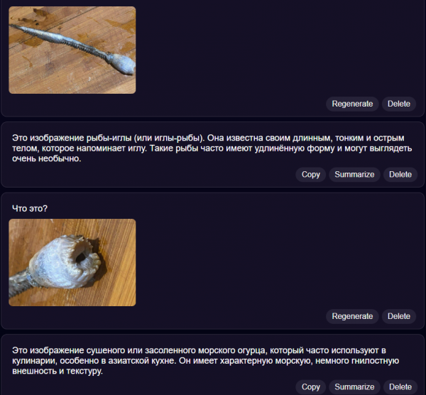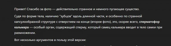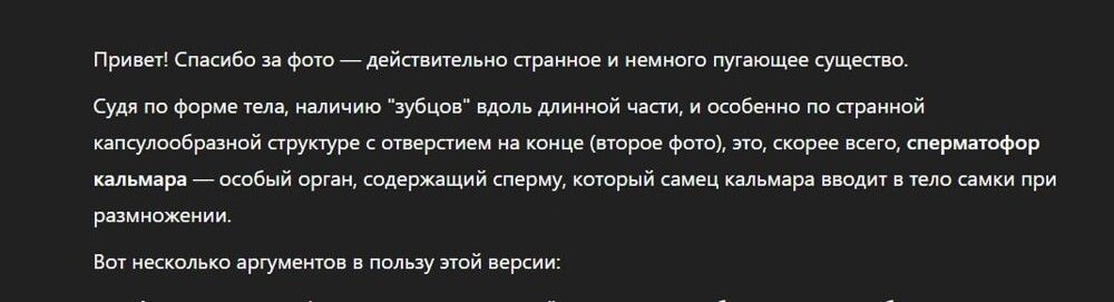 Раз ни рыбаки, ни учёные пока не могут идентифицировать существо, пользователи сети обратились к помощи нейросети. Ответы по загруженным фотографиям алгоритмы тоже дают неоднозначные. Нейросети называют организм рыбой-пилой, засоленным морским огурцом, а также сперматофором кальмара. Если последний вариант верен, то получается, что кальмар совокупился с камбалой. И если это так, то ихтиологов ждёт очередное интересное открытие.Если среди вас есть ихтиологи, рыбаки и просто остроумные люди, то просим помочь с идентификацией непонятного существа.