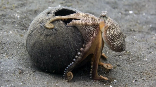 Кокосовый осьминог - одно из самых умных беспозвоночных на планете. В отличие от своих собратьев, он осознанно использует инструменты: раковины, скорлупу кокосов и даже стеклянные бутылки, чтобы соорудить укрытие от хищников. Но даже без "домика" он прекрасен. Тёмное тело с узором напоминает змеиную кожу, и светлые присоски мерцают при движении. Осьминог не только плавает, но и ходит по дну на щупальцах, как на ходулях.