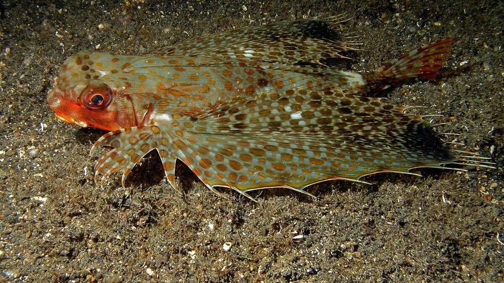 Она выглядит как легкомысленная морская бабочка, но на самом деле - мастер психологической защиты. Летающий или шлемоносный гурнард - это рыба, которая в случае опасности превращает свои плавники в гипнотизирующий веер.Её огромные грудные плавники, украшенные синими узорами, внезапно раскрываются, чтобы напугать хищников. Это не для полёта, а для эффектного "Бу!" Ещё морская красавица умеет "хрюкать" с помощью плавательного пузыря (по-французски gurnard - это "ворчание"). И, несмотря на название, она не летает, а передвигается короткими рывками у дна.