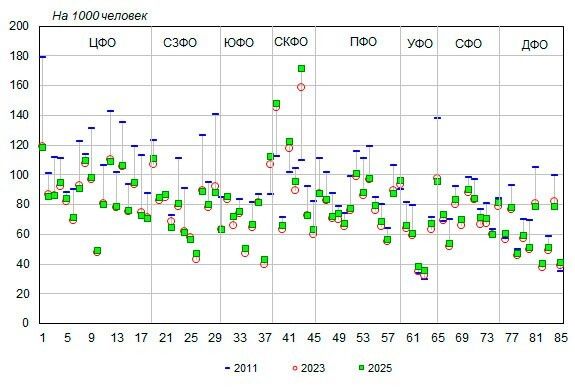 В Чеченской республике из 1000 жителей 171 имеет инвалидность. Это один из самых высоких показателей инвалидизации в стране. Чуть отстают от Чечни другие республики: 148 на 1000 человек в Ингушетии, 122 - в Карачаево-Черкесии, 112 - в Дагестане - сообщает издание "Демоскоп" со ссылкой на Росстат.В Чечне же наблюдается наибольший рост уровня инвалидности (на 56%, со 110 на 1000 человек в 2011 году до 171 в 2025 году), т.е. этот показатель год от года неуклонно растёт. Другие кавказские республики тоже демонстрируют рост, но не такой стремительный : в Ингушетии на 32% за вышеозначенный период (со 112 до 148 на 1000 человек), в Дагестане на 30% (с 86 до 112 на 1000 человек), в Карачаево-Черкесии - на 21% (со 101 до 122 на 1000 человек).