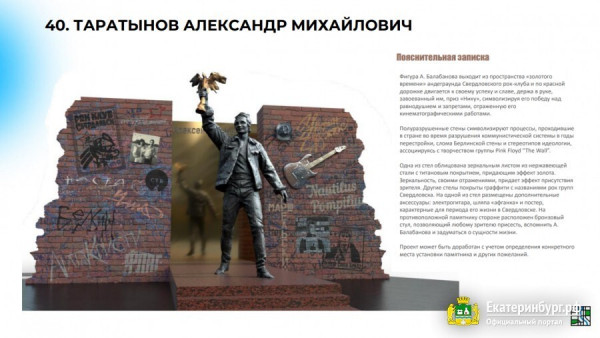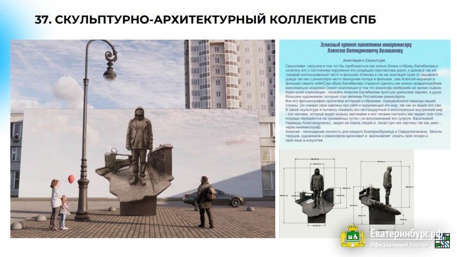 В мэрии Екатеринбурга объяснили выбор эскиза с трамваем. В администрации написали, что герои фильмов Балабанова всегда находятся в движении, которое символизирует транспорт в композиции. Плюс к этому, грузовой трамвай хорошо известен зрителям Балабанова, они нередко появлялись в его картинах, включая культового "Брата"."Трамвай появлялся во многих его картинах, в том числе и в культовой картине "Брат". Тяжеловесная конструкция выглядит легко и воздушно за счёт сквозного пространства. Трамвай, словно кадр в кинопленке, обрамляет реальность. Фигура режиссёра выглядит простой, скромной и одинокой на контрасте с объёмом трамвая. Режиссёр словно ждёт истории, он наблюдает, ищет вдохновения", - говорится на сайте администрации города.Согласно задумке автора эскиза, прохожим позволят зайти в трамвай, сесть рядом с фигурой режиссёра и сфотографироваться.