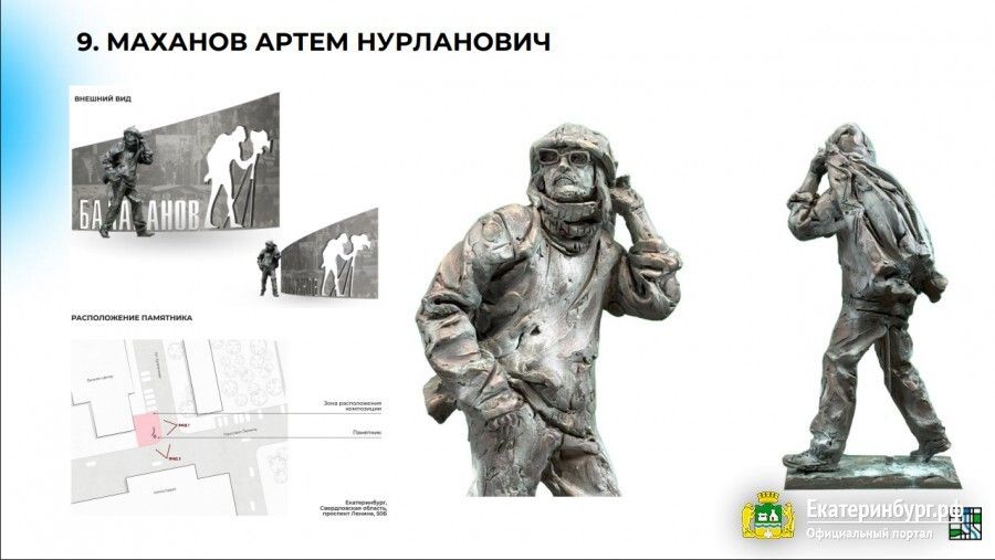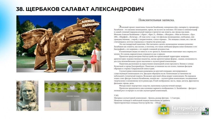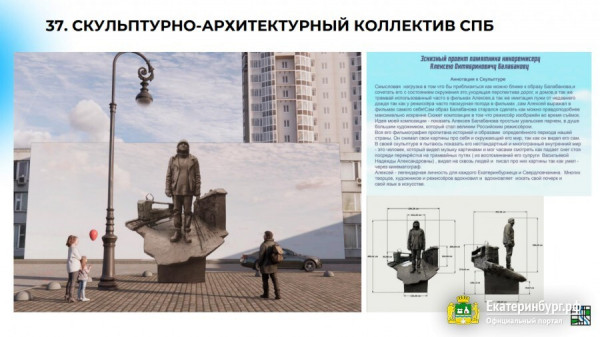 Власти Екатеринбурга утвердили эскиз будущего памятника культовому режиссёру Алексею Балабанову. Победителем в конкурсе стал скульптор Мейрам Баймуханов, на эскизе которого Балабанов изображён в знаменитой "афганской" панаме сидящим в одиночестве в трамвайном вагоне.Сообщается, что памятник власти планируют установить в мае 2026 года у Дворца молодёжи. Неподалёку расположен дом, в котором он жил, а также школа, где он учился.