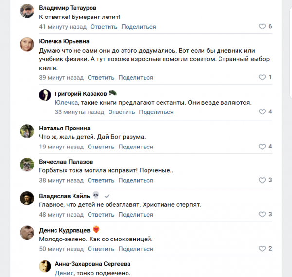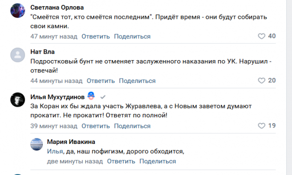 В соцсетях также обратили внимание на то, что Новый Завет, возможно, не православный, а сектантский, который распространяют запрещённые организации. Будут ли в этом случае подростков проверять правоохранители и что последует за их проступком, пока неизвестно. Ясно одно: любителей привлекать к себе внимание любым скандальным способом меньше не становится. На всякий случай напоминаем: по статье 148 УК РФ за публичное оскорбление чувств верующих подросткам старше 16 лет могут назначить штраф до 300 тысяч рублей или обязательные работы. Детей младше этого возраста чаще всего ставят на учёт, а ответственность за проступки падает на их родителей, которым могут назначить штраф до 20 тысяч рублей или административный арест.