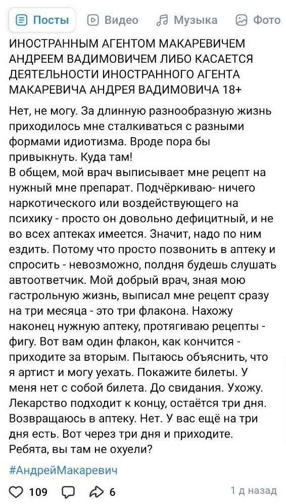 Как человек немолодой, он регулярно обращается к врачам. В один из визитов выяснилось, что Макаревичу* придётся принимать рецептурный препарат. Он довольно дефицитный, и, чтобы хватило надолго, медик выписала артисту рецепт сразу на три месяца, т.е. на 3 флакона лекарства. Когда музыкант нашёл аптеку, в которой препарат был в наличии, обнаружил, что получить сразу 3 флакона ему не дают."Вот вам один флакон, как кончится - приходите за вторым. Пытаюсь объяснить что я артист и могу уехать. Покажите билеты. У меня нет с собой билета. До свидания. Ухожу. Лекарство подходит к концу, остаётся три дня. Возвращаюсь в аптеку. Нет. У вас ещё на три дня есть. Вот через три дня и приходите", - рассказывает А. Макаревич*Ребята, вы там не о***ли?!" - негодует почетный пенсионер Израиля, ранее народный артист РФ и лидер группы "Машина времени".