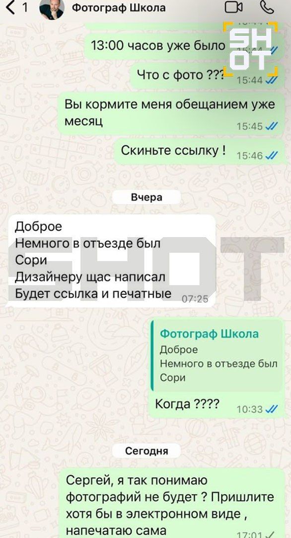 Родители кидали деньги на карту исполнителю, и тот действительно проводил фотосессии. Например, школоту в Красногорске он отфоткал ещё в феврале, обещал завезти готовые альбомы в школу, но там так и не появился."Пришёл, предложил свои услуги, наобещал много бонусов и удобные условия. После съёмки взял аванс, а далее кормил завтраками и требовал полную оплату", - рассказала нам мама выпускника из Красногорска.Выпускники из других городов жалуются, что им вместо альбомов Сергей кинул пустые ссылки на диск, без фото, а потом кинул в блок. Теперь семьи подростков, оставшихся без альбомов, хотят объединиться и написать коллективное обращение в прокуратуру.