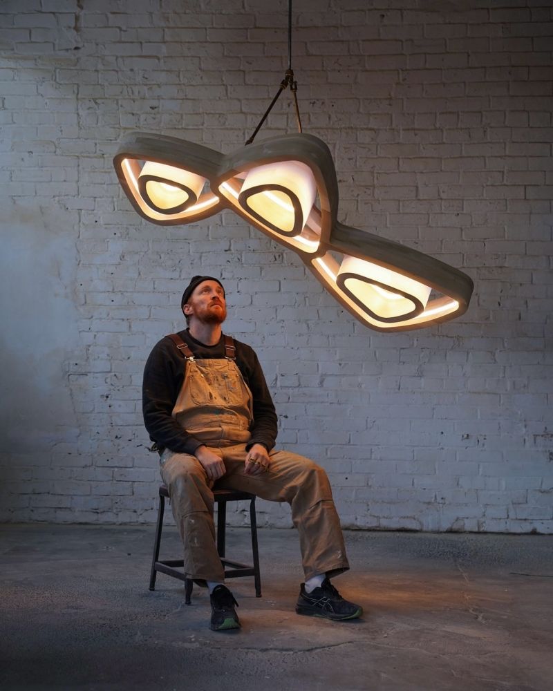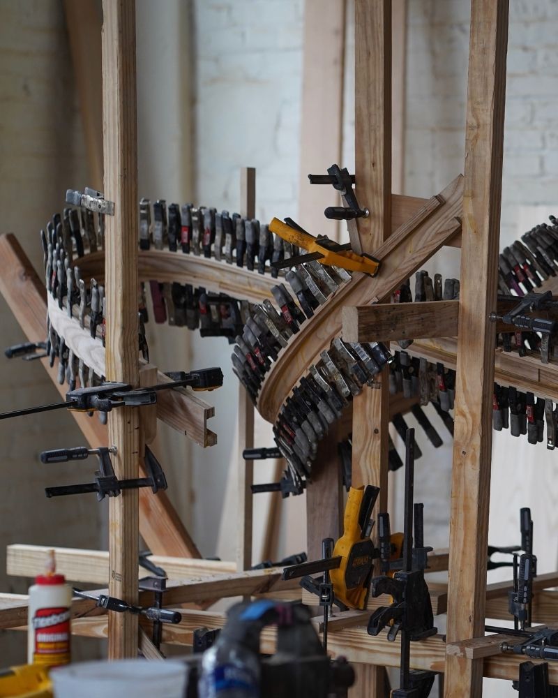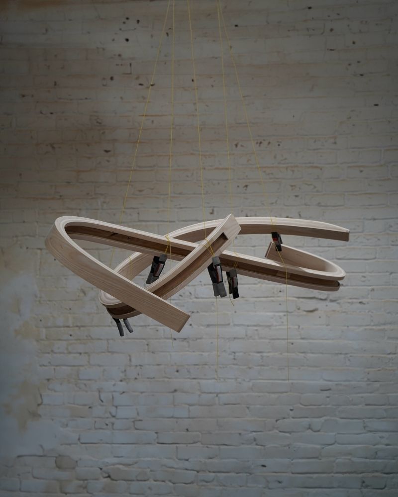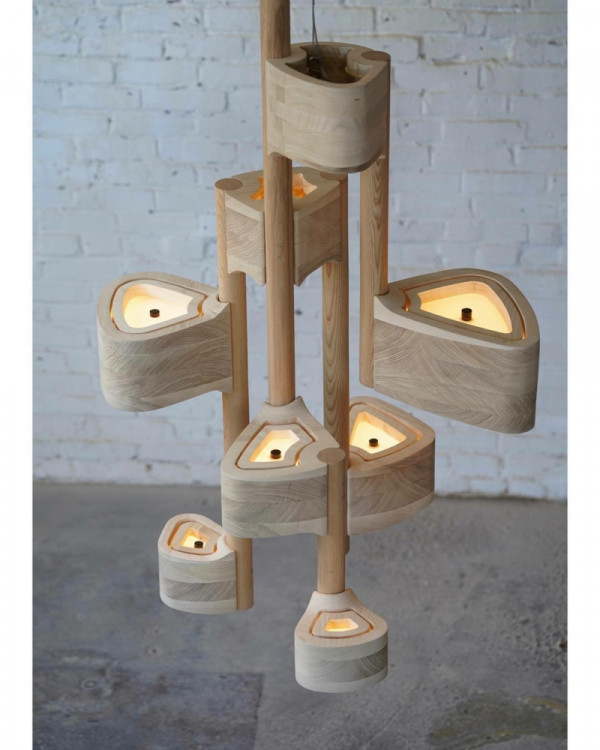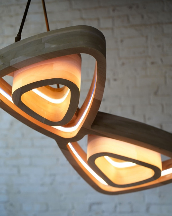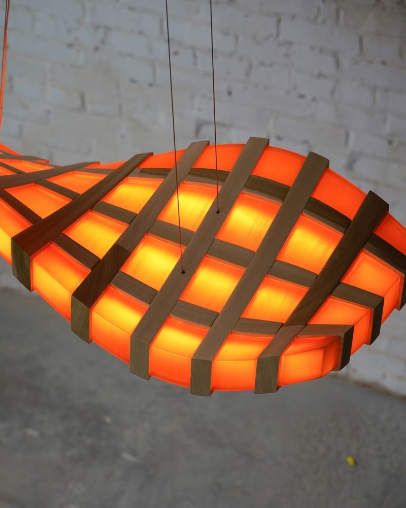 Мужичок гнёт отпаренную древесину. Прикольные лампы получаются - цен не знаю, но видимо недёшево.1