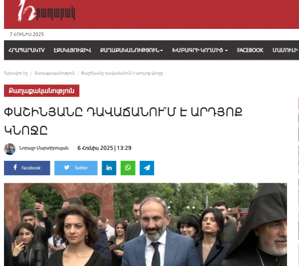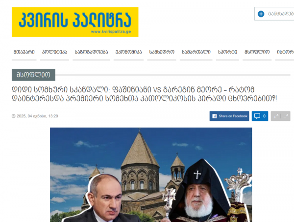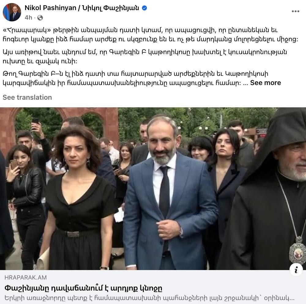Данный пост Пашиняна прокомментировала главный редактор "Грапарак" Армине Оганян: "То есть у тебя есть право задавать вопросы, каждый день спрашивать Католикоса, нарушил ли он обет безбрачия, а у автора статьи нет такого права?"В главном соборе Святого Эчмиадзина тоже молчать не стали и провели заседание Высшего теологического совета под руководством Католикоса всех армян Гарегина II, на котором был дан ответ Пашиняну.