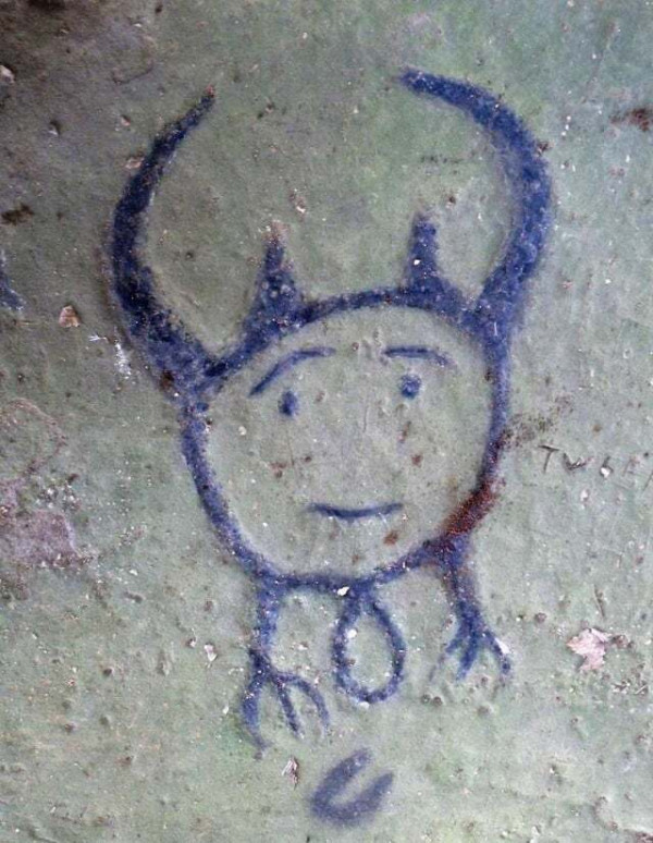 Это петроглиф, сделанный американскими индейцами в 1000-1650 гг. Петроглиф - древнее изображение, высеченное или выгравированное на камне. Данный петроглиф лица с головным убором является частью петроглифа Льва, который содержит 37 изображений людей и других животных, а также отпечатки ног каждого из них.