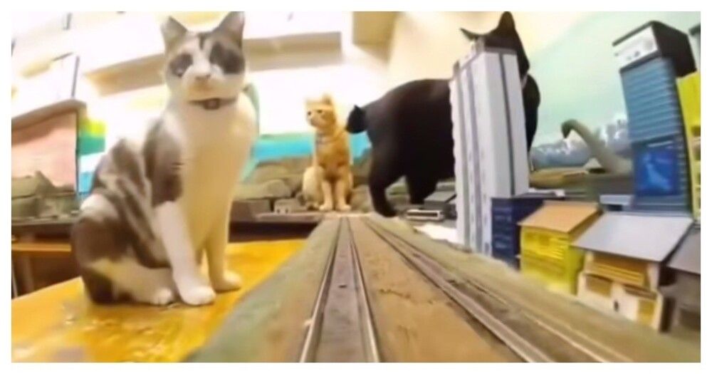 Попытка игрушечного поезда проехать мимо котиков. Все железнодорожные перевозки коту под хвост...