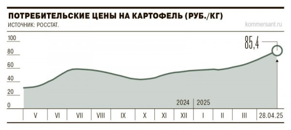 Цены на картофель бьют все мыслимые и немыслимые рекорды. В апреле 2025 года по данным Росстата средняя цена составляла 85 рублей, тогда как годом раньше она не превышала 30 руб. На ситуацию с корнеплодом обратил внимание даже президент РФ.